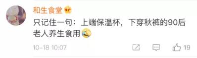 “上端保温杯、下穿秋裤的90后中年老人养生食用”
