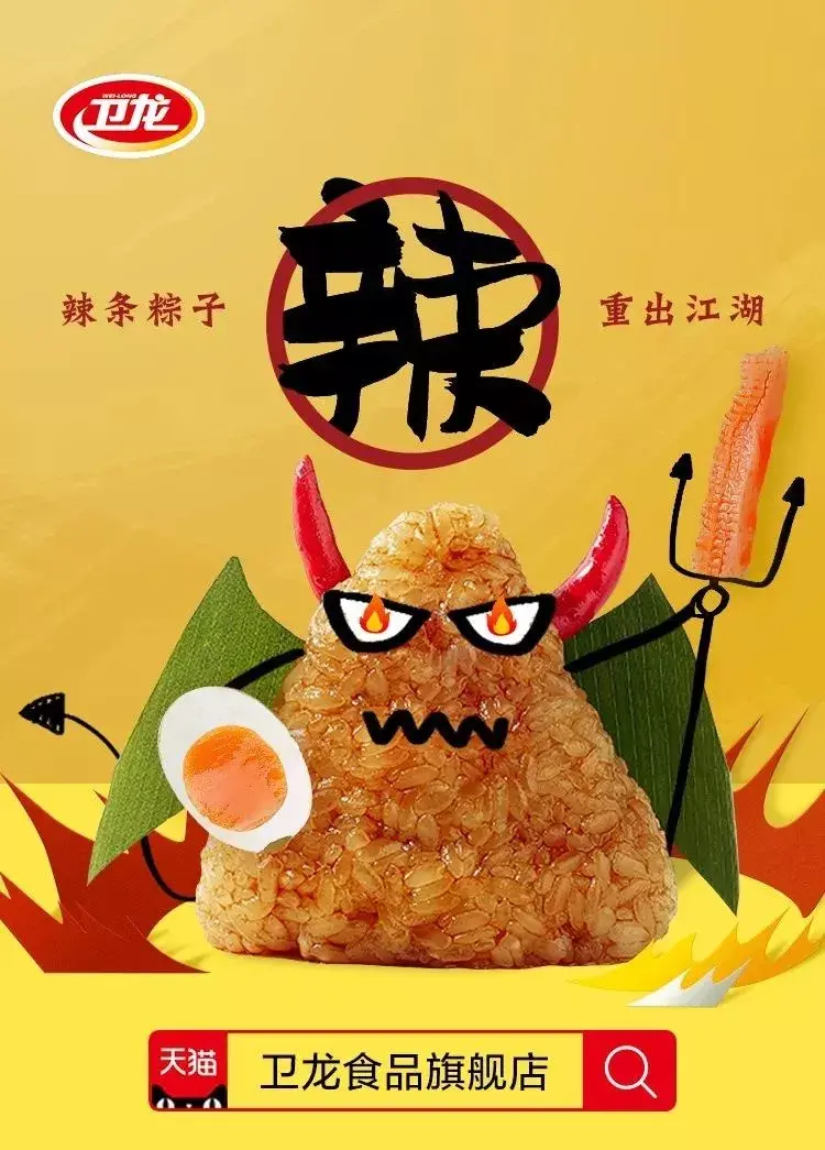 卫龙直接出了辣条粽子,不只是有海报,还有逗逼的卫龙“辣二代”之自白漫画以及四川口味儿的鬼畜视频,有比占据你的胃之外更好的营销吗?!买它!