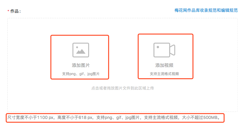 作品格式要求:图片尺寸宽度不小于1100 px,高度不小于618 px,支持png、gif、jpg图片;支持主流格式视频,大小不超过500MB。