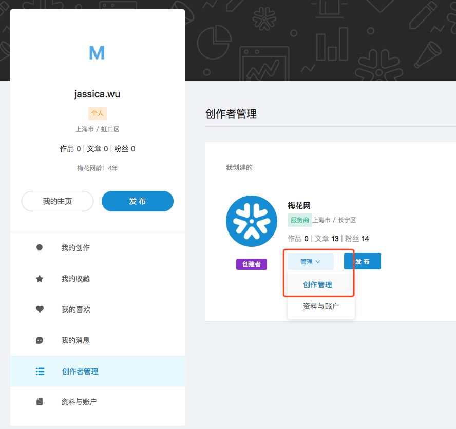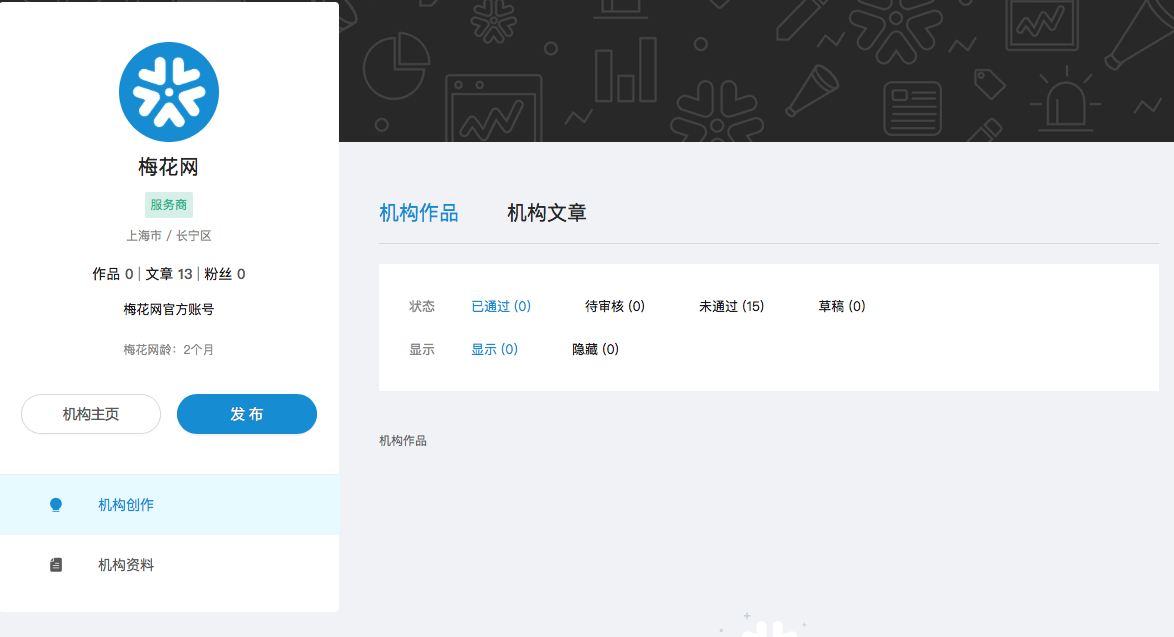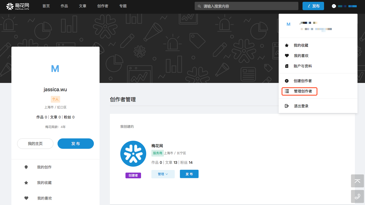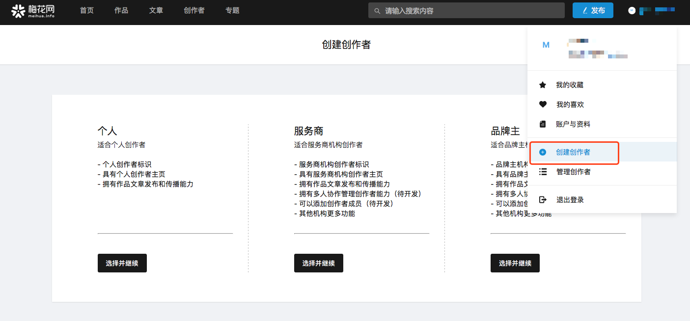 点击右上角头像,点击创建创作者,选择自己的创作者类型,完善机构基本信息,点击提交审核。待机构审核通过后,即可点击右上角【发布】在梅花网发布作品。