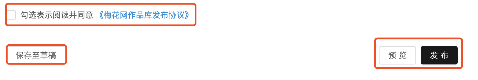 十四、勾选表示阅读并同意 《梅花网作品库发布协议》,即可保存、预览及发布作品