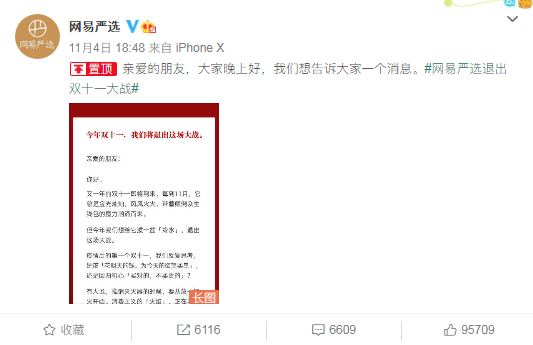 继反消费主义的广告片后,11月4日网易严选正式官宣退出#双十一大战#。网易严选表示今年“不做复杂优惠玩法、不发战报、不再为销售额开庆功会”,并称已为大家搞定全年最大力度补贴。