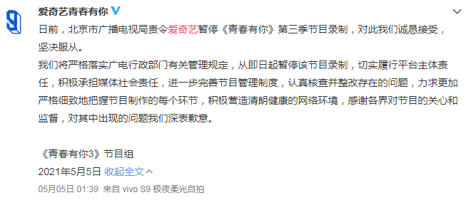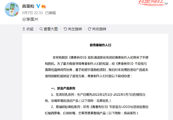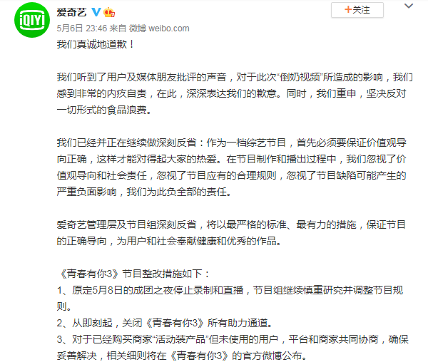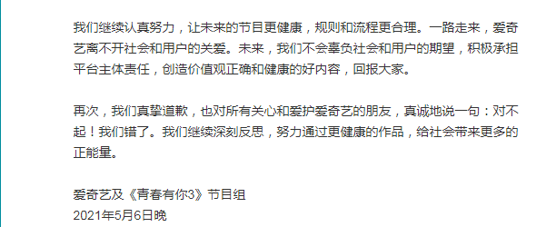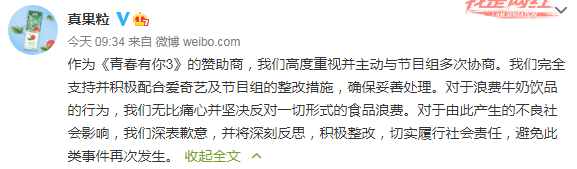 爱奇艺、《青春有你3》节目组和真果粒第一时间公开道歉。