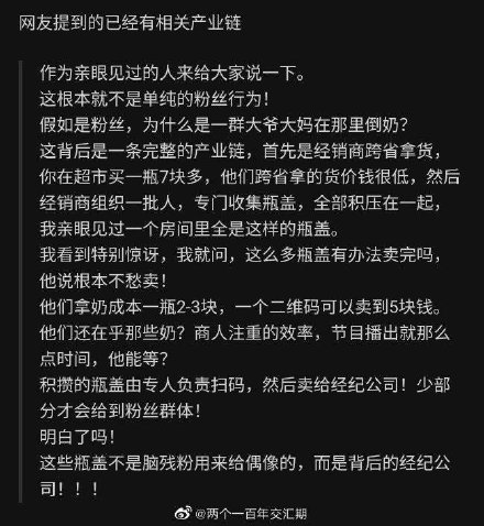 另一边,花了钱又遭受网络暴力的粉丝们出面反击,委屈发帖说自己并没有倒奶或雇人倒奶,将矛头指向背后产业链。