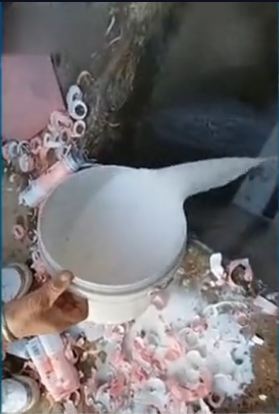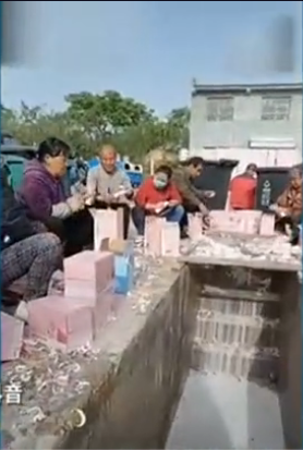 画面里大爷大妈们围坐在沟渠旁,一大桶一大桶的“牛奶”被倒掉了。