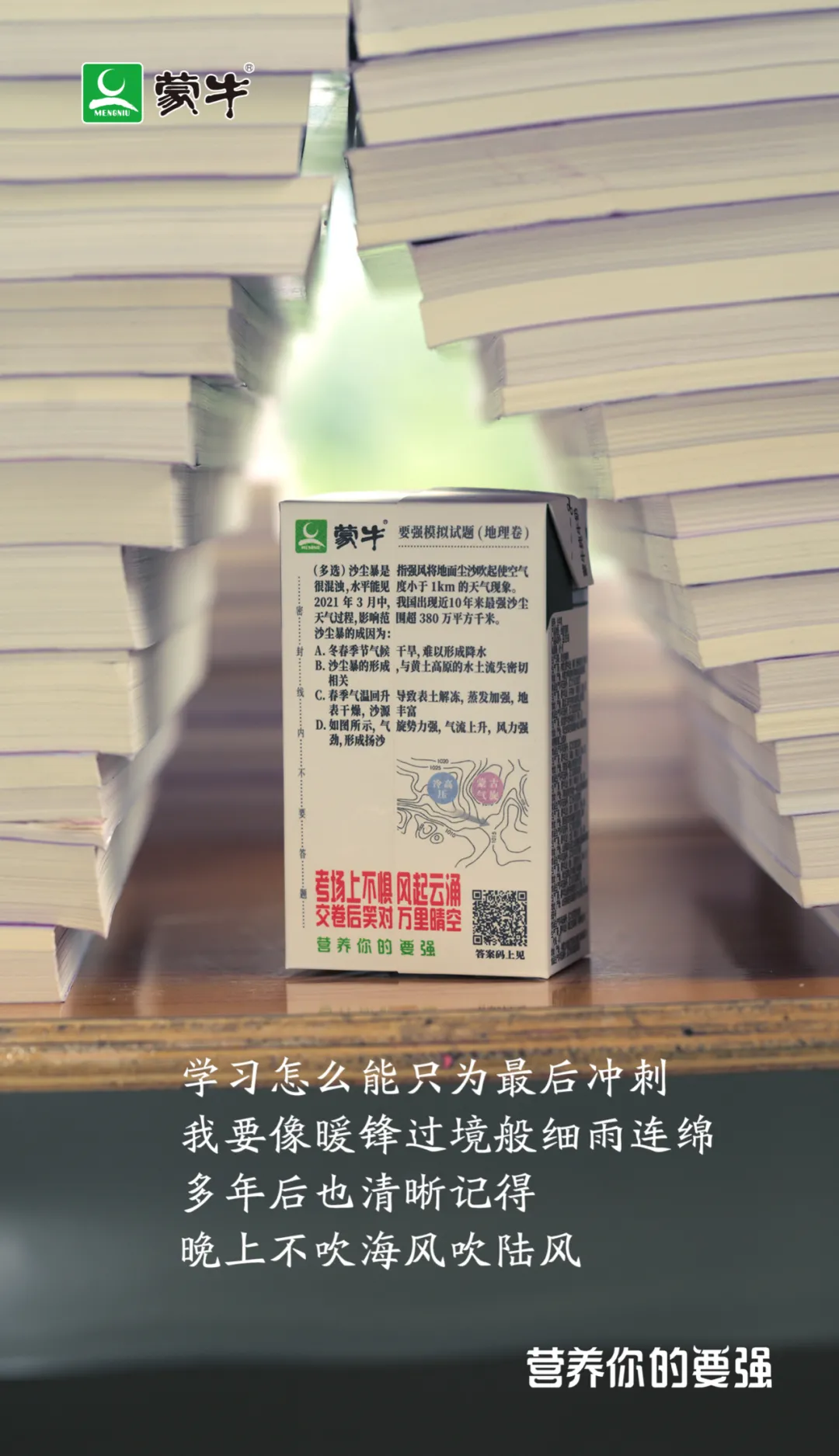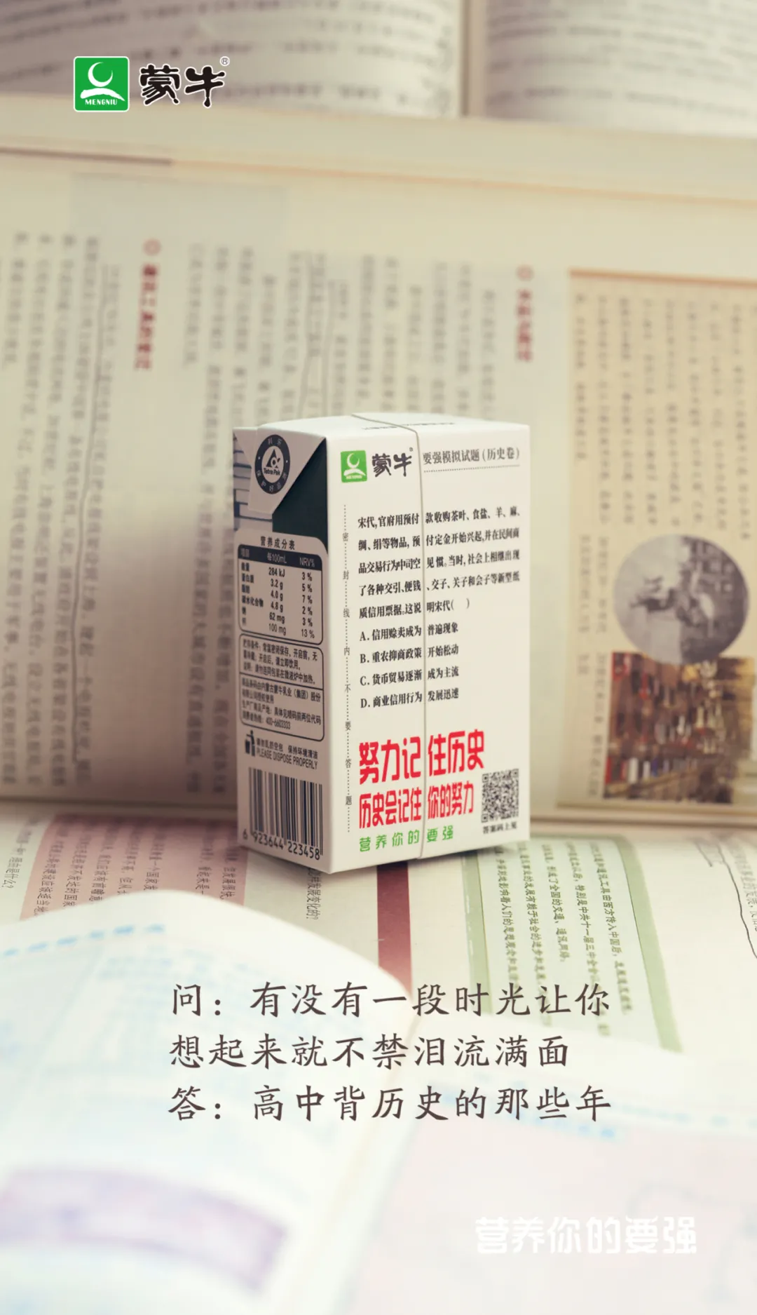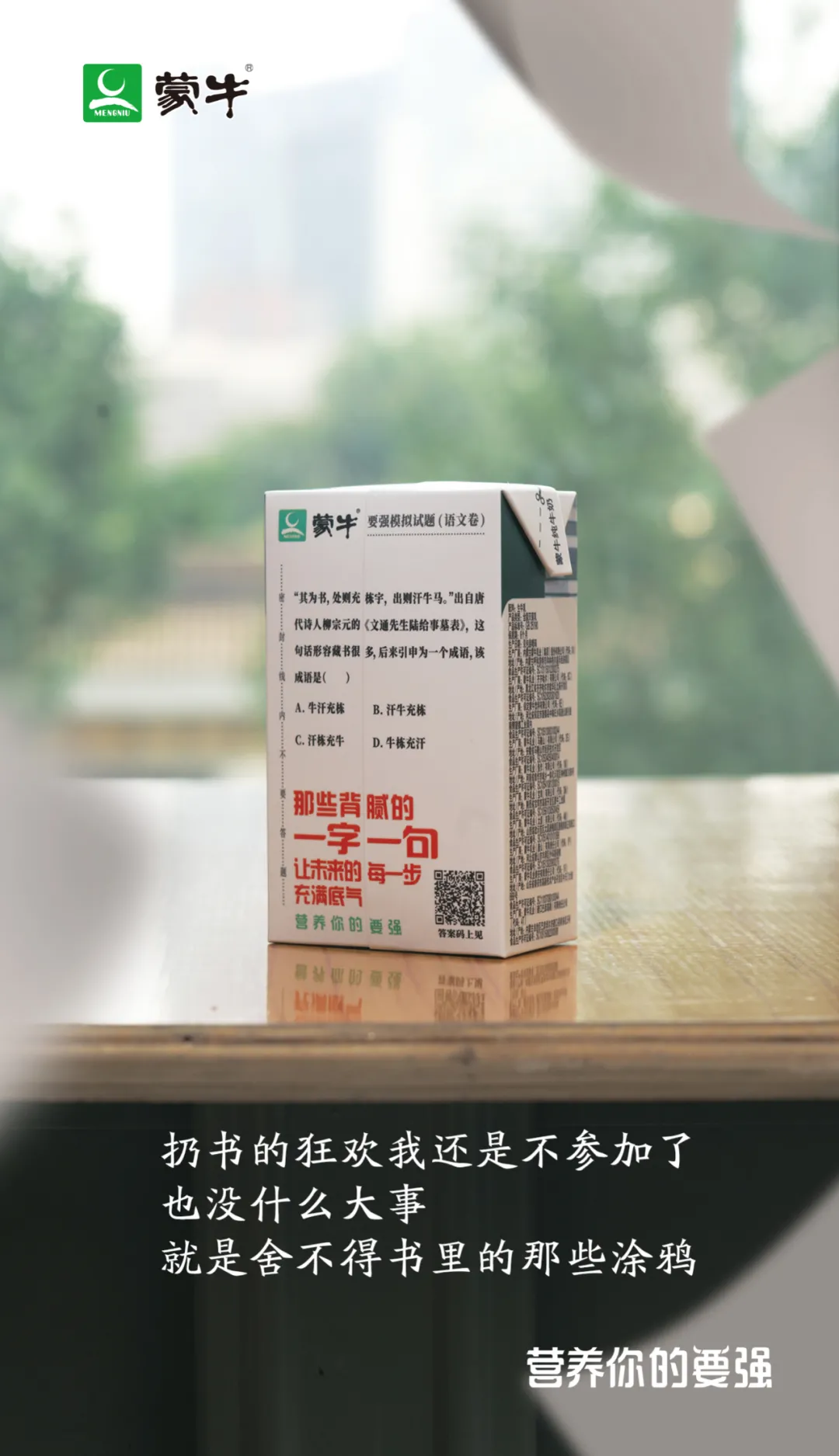 近日蒙牛「高考押题奶」2.0版本如约而至,一次性集结语文、数学、化学、历史等模拟考卷押题,冲鸭高考生们,边喝边复习。