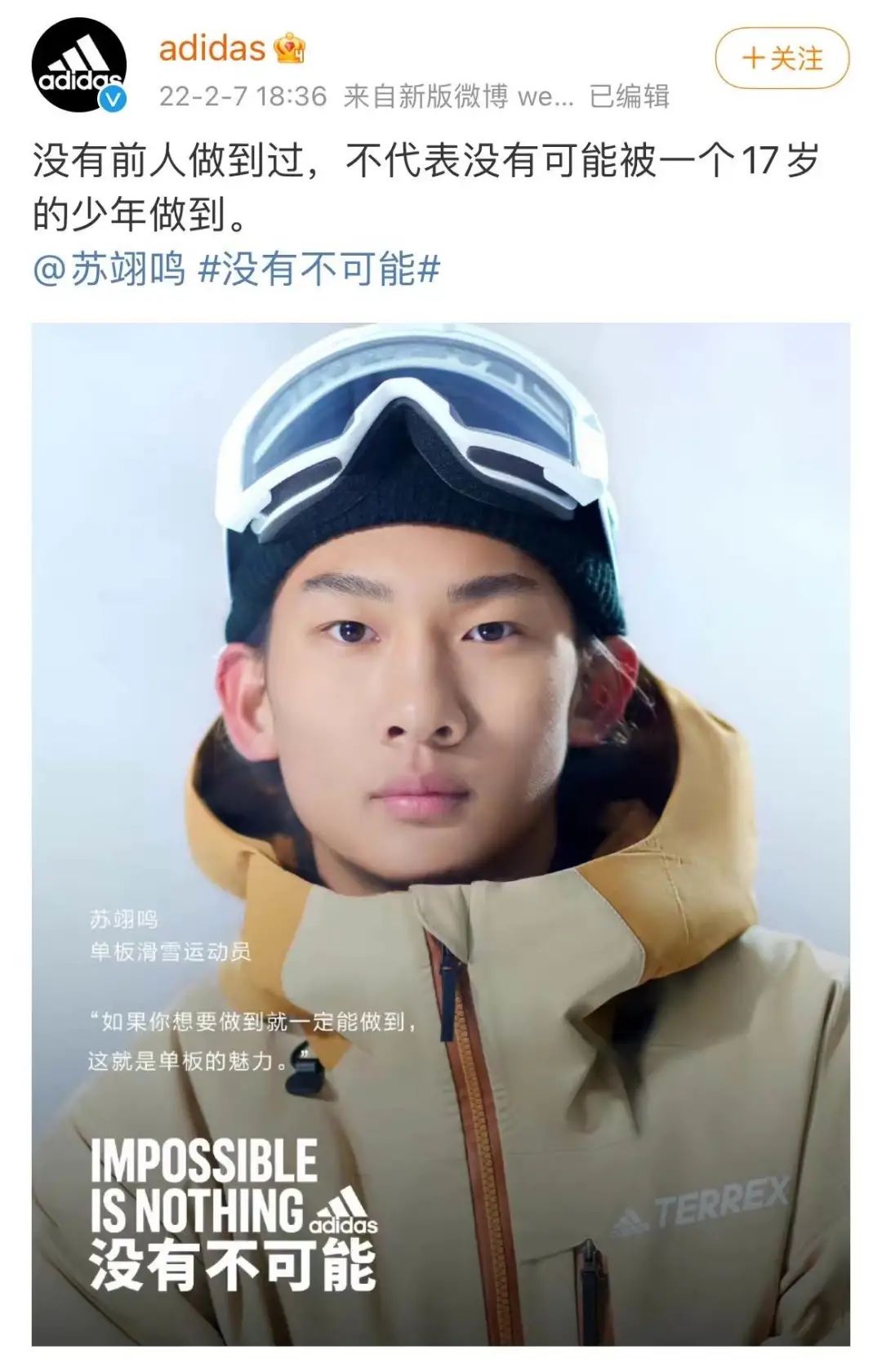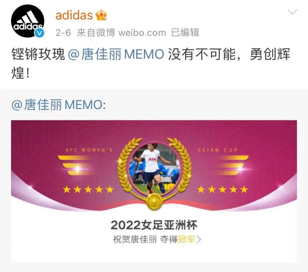 另一边,adidas借势苏翊鸣,并庆祝中国女足成员,同时也热刺女足成员的选手唐佳丽夺冠。