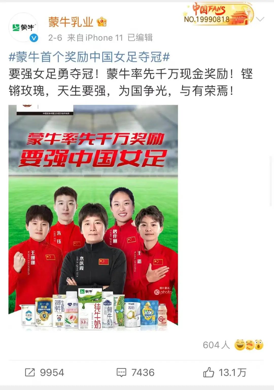 女足夺冠仅1小时后,蒙牛官博就表示会给予现金奖励