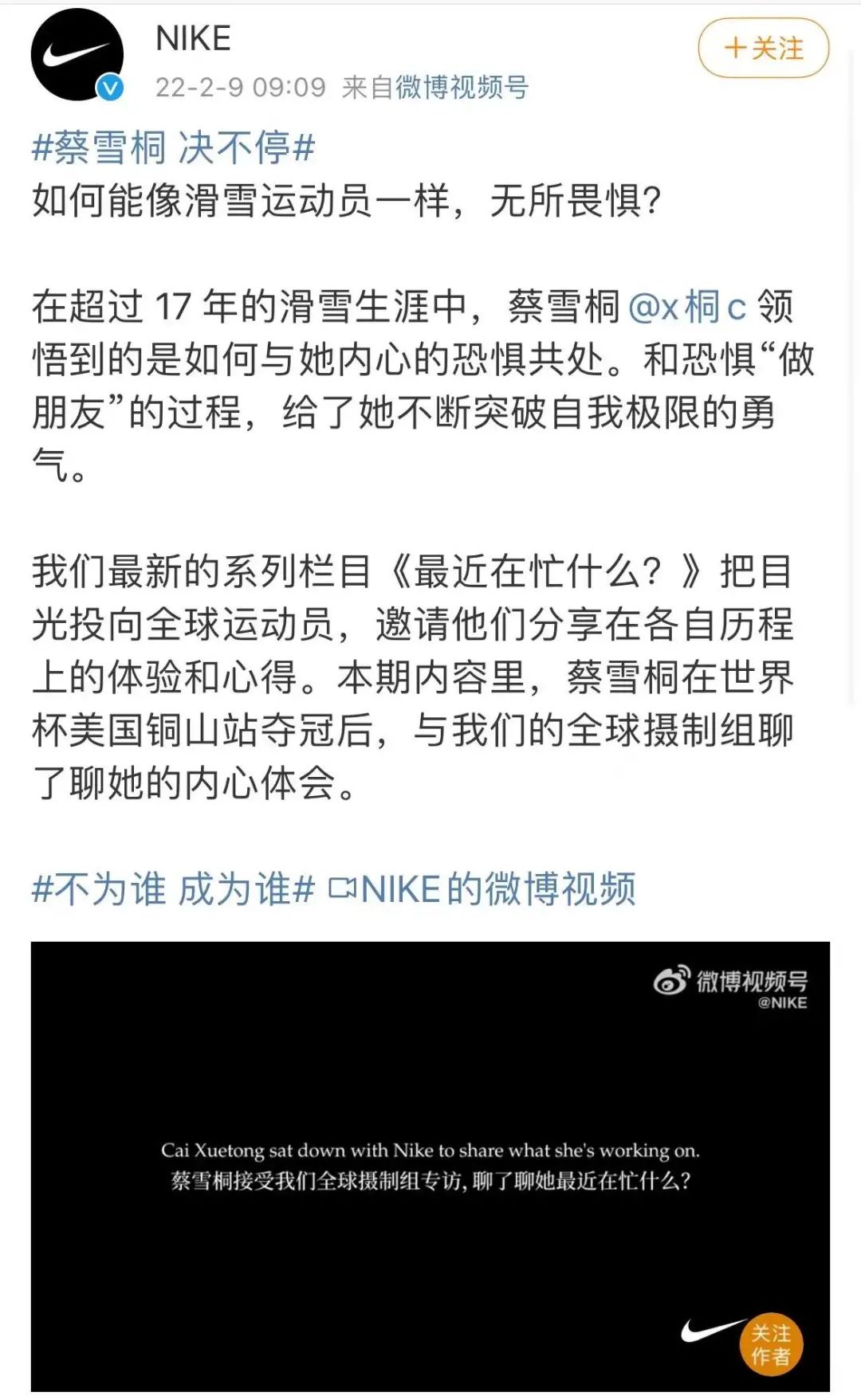 耐克还上线了系列栏目《最近在忙什么?》,讲述中国单板滑雪运动员蔡雪桐的故事。