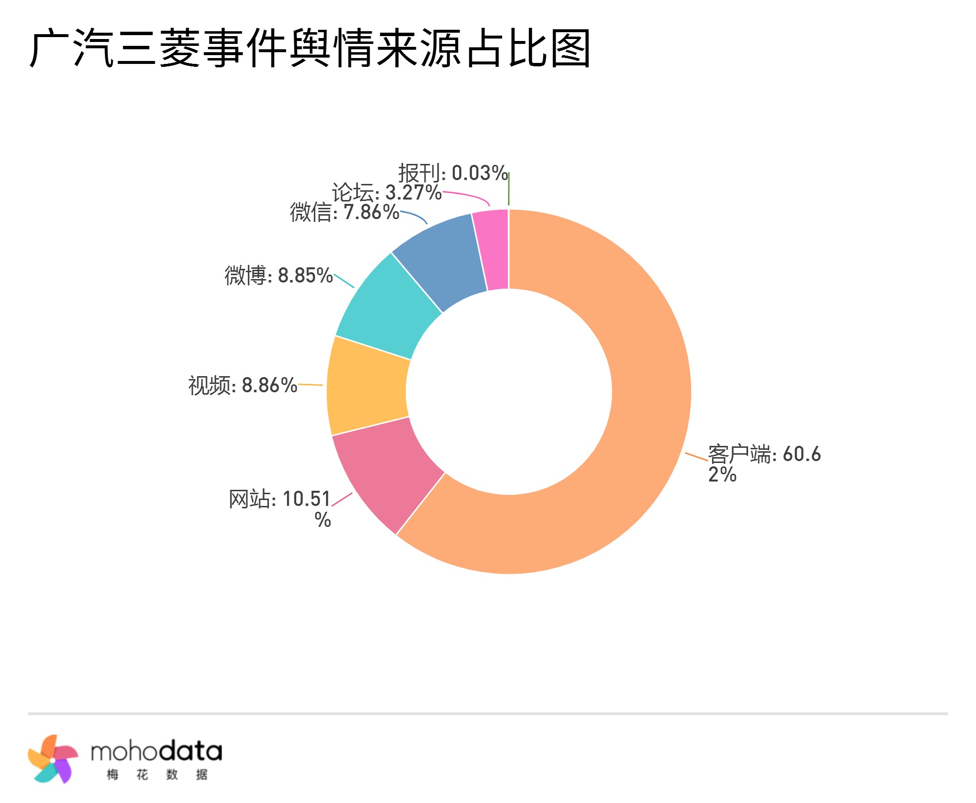 其中信息来源分布图如下图所示,声量主要集中在客户端,客户端占比60.62%,网站占比10.51%,其他信息来源占比不超过10%。