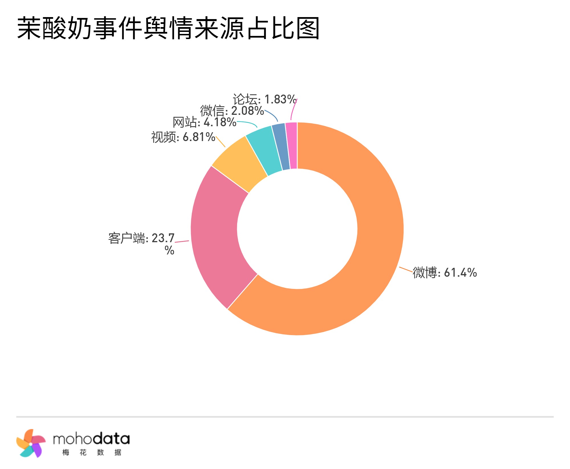 其中信息来源分布图如下图所示,声量主要集中在微博,微博占比61.40%,客户端占比23.70%,其他信息来源占比不超过10%。