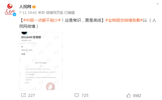 7月11日19点43分,人民网发表微博:“【#中国一点都不能少#!这是常识,更是底线】#宝格丽发微博致歉#↓↓ ”,并放出宝格丽回应截图。