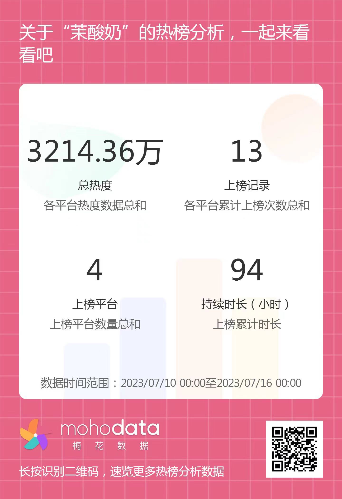 热搜方面,茉酸奶事件相关热搜热度总计3214.36万,上榜记录13次,上榜平台4家,持续时长94小时。详情可扫描以下二维码查看。