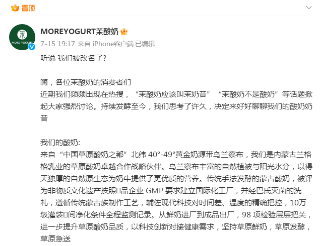 针对近期在热搜上的争议,7月15日晚,@MOREYOGURT茉酸奶发文称:听说我们被改名了?