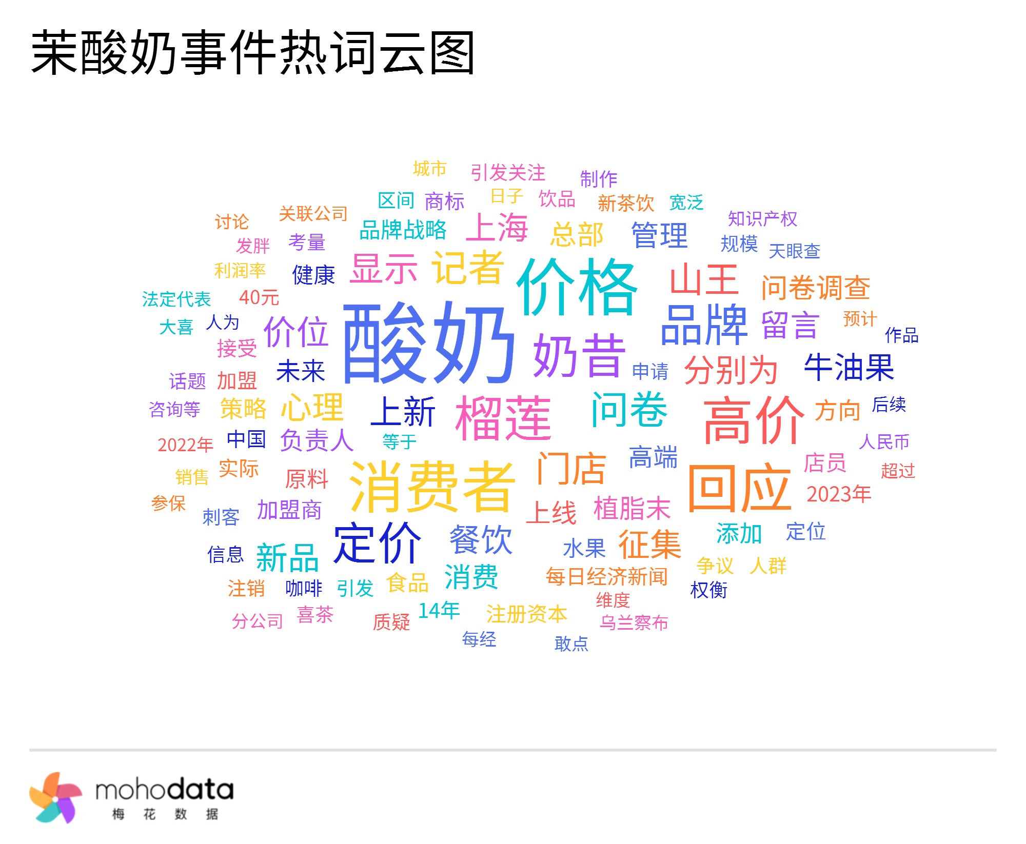 声量热词方面,热词云图如下所示,其中“价格”“高价”“奶昔”“定价”“植脂末”“高端”“原料”“健康”“争议”“质疑”等词汇排名较前。