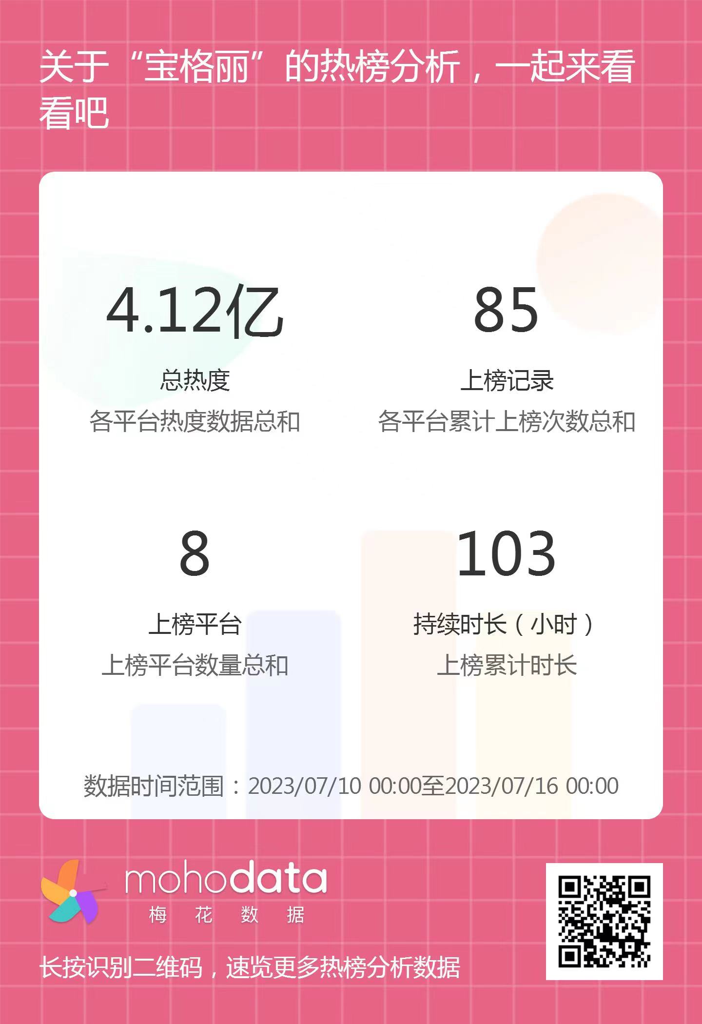 热搜方面,梅花数据统计此次宝格丽事件的相关热搜,其中热搜热度总计4.12亿,上榜记录85次,上榜平台8家,持续时长103小时。详情可扫描以下二维码查看。