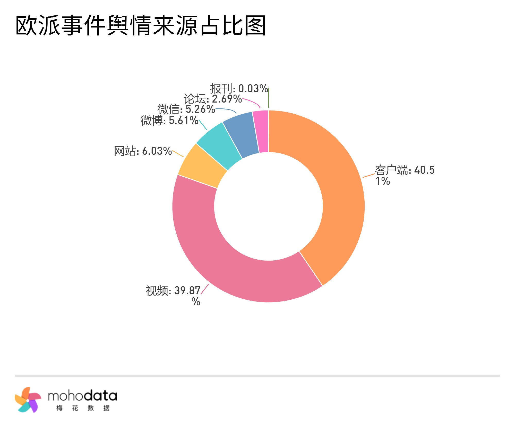 其中信息来源分布图如下图所示,声量主要集中在客户端,客户端占比40.51%,视频占比39.87%,其他信息来源占比不超过10%。