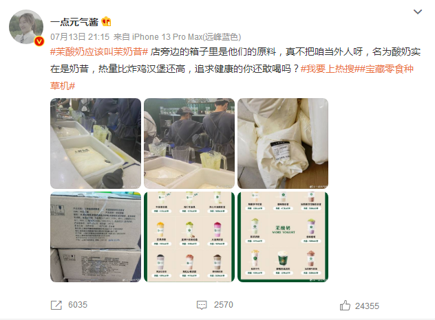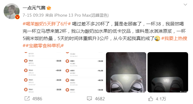 7月15日,有网友称#喝茉酸奶5天胖了6斤#,质疑制作原料使用冰淇淋原浆。