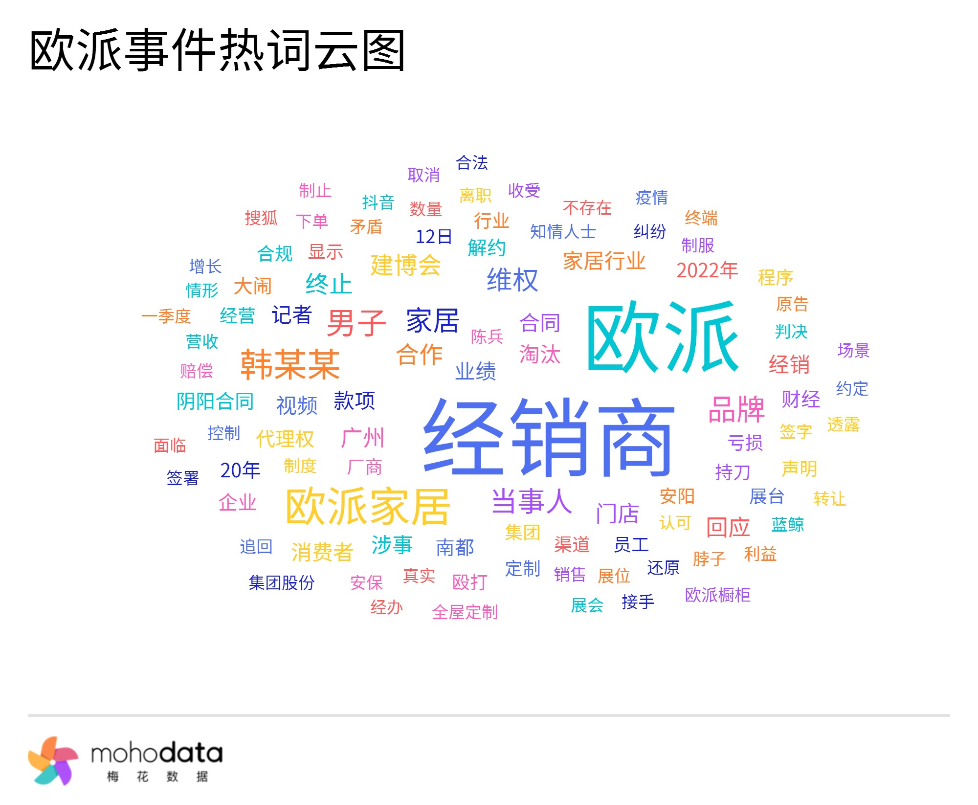 声量热词方面,热词云图如下所示,其中“经销商”“维权”“建博会”“阴阳合同”“代理权”“大闹”“解约”“殴打”“持刀”“矛盾”“制服”等词汇排名较前。