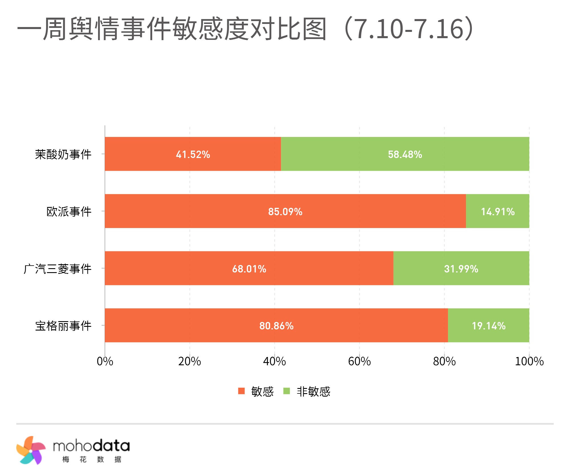 敏感度方面,“欧派事件”相关的敏感度最高,占比达85.09%。“宝格丽事件”占比达80.86%, “广汽三菱事件”占比达68.01%, “茉酸奶事件”占比达41.52%。