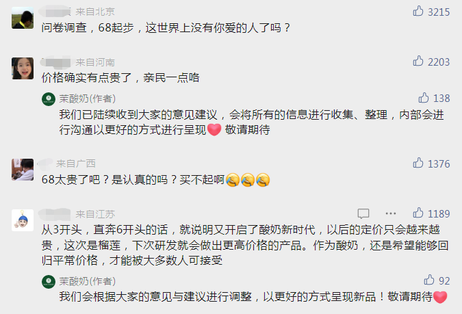 在此次问卷调查的文章下,有不少消费者反映价格太贵了,建议亲民一点,茉酸奶也多次于评论回应称“我们已陆续收到大家的意见建议,会将所有的信息进行收集、整理,内部会进行沟通以更好的方式进行呈现”、“我们会根据大家的意见与建议进行调整,以更好的方式呈现新品”。