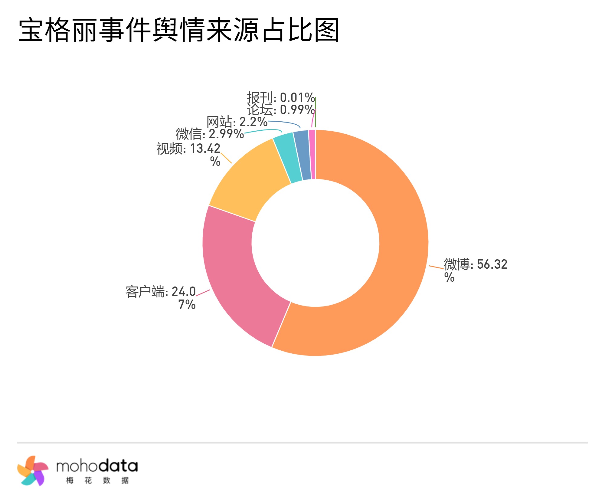 其中信息来源分布图如下图所示,声量主要集中在微博,微博占比56.32%,客户端占比24.07%,视频占比13.42%,其他信息来源占比不超过10%。