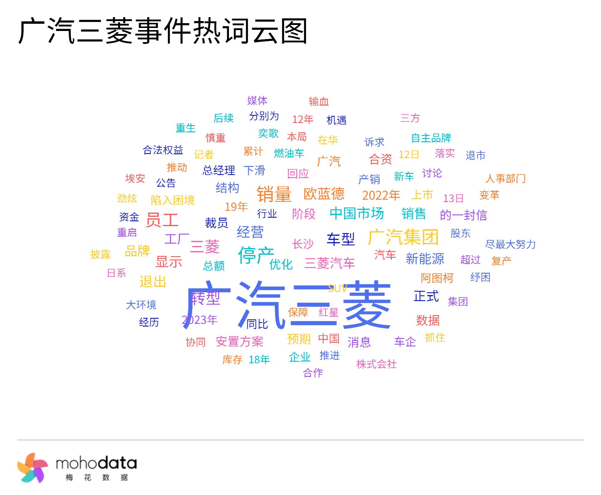 声量热词方面,热词云图如下所示,其中“广汽集团”“员工”“转型”“中国市场”“新能源”“优化”“合资”“安置方案”“陷入困境”“自主品牌”“大环境”等词汇排名较前。