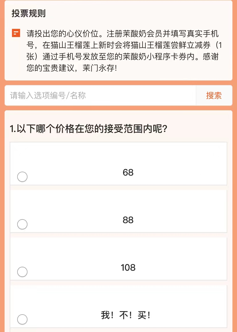 据了解,茉酸奶近日上线了一份问卷调查,征集消费者对于即将上新的猫山王榴莲奶昔的心理价位,可选价格分别为68元、88元、108元,以及“我!不!买!”。