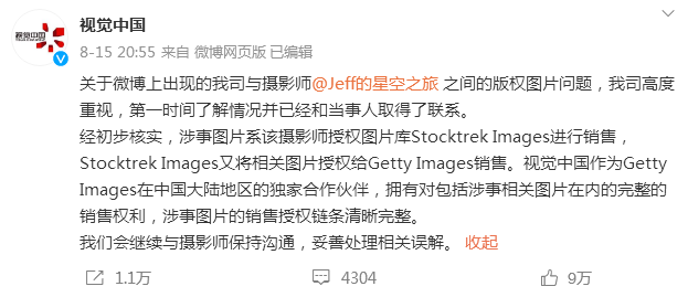 8月15日晚,视觉中国对此事做出回应:对于相关版权图片问题,已第一时间了解情况并已经和当事人取得了联系。经初步核实,涉事图片系该摄影师授权图片库Stocktrek Images进行销售,Stocktrek Images又将相关图片授权给Getty Images销售。视觉中国作为Getty Images在中国大陆地区的独家合作伙伴,拥有对包括涉事相关图片在内的完整的销售权利,涉事图片的销售授权链条清晰完整。视觉中国表示会继续与摄影师保持沟通,妥善处理相关误解。