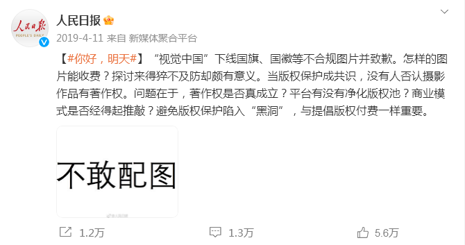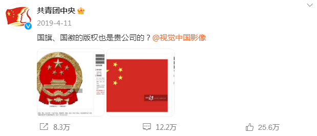 随后,共青团中央官方微博@共青团中央发布了两张在视觉中国网站上提供的中国国旗和国徽图案的截屏,上述截屏中带有“版权所有:视觉中国”的版权声明以及如用于商业请咨询的电话。共青团中央官博发出质问:“国旗、国徽的版权也是贵公司的?”