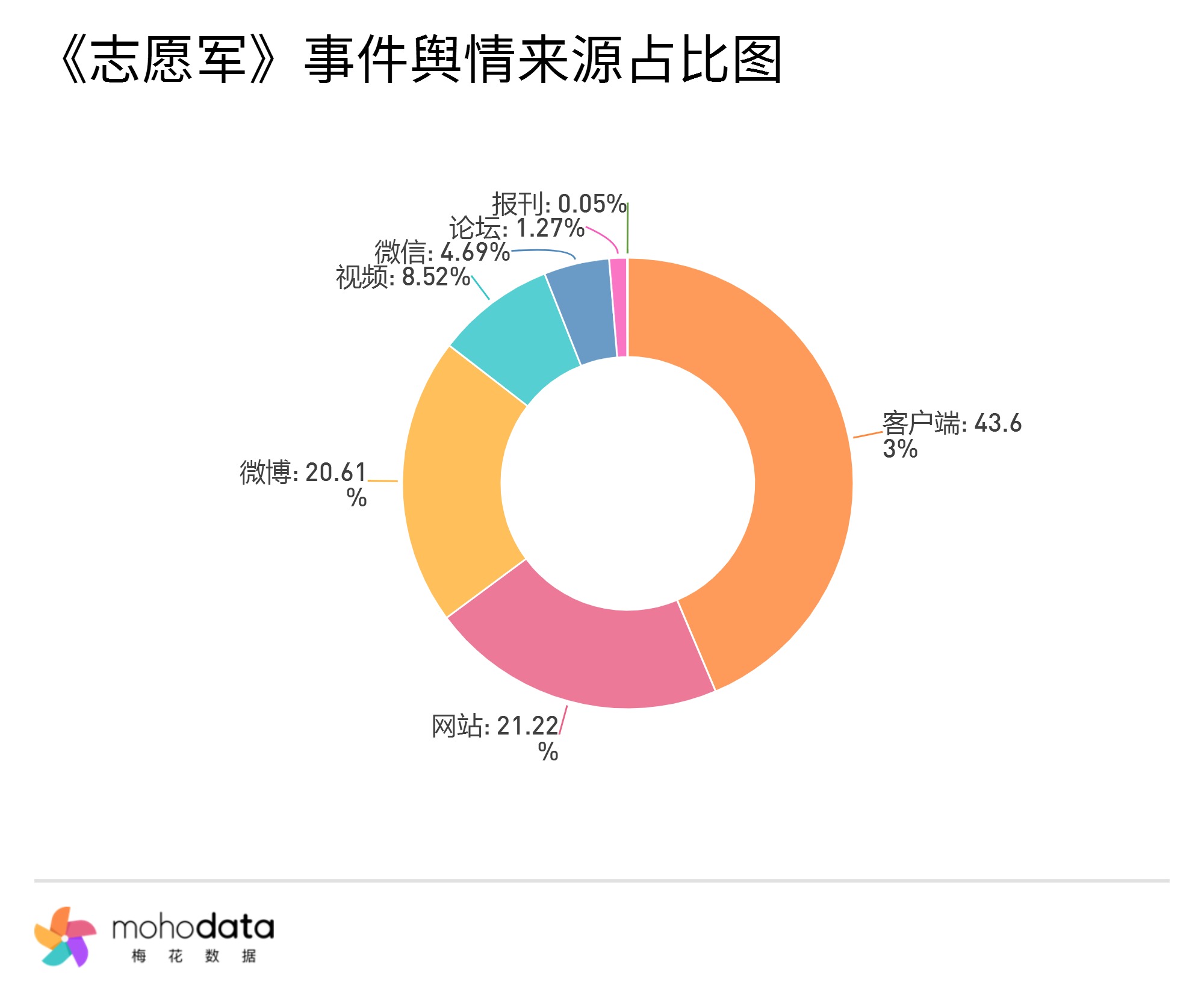 其中信息来源分布图如下图所示,声量主要集中在客户端,客户端占比43.63%,网站占比21.22%,微博占比20.61%,其他信息来源占比不超过10%。