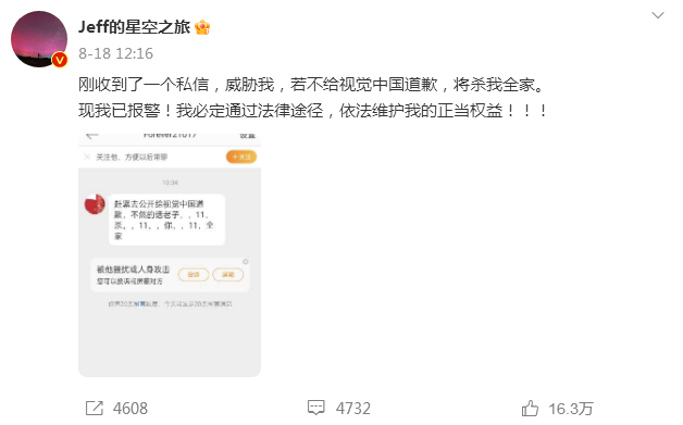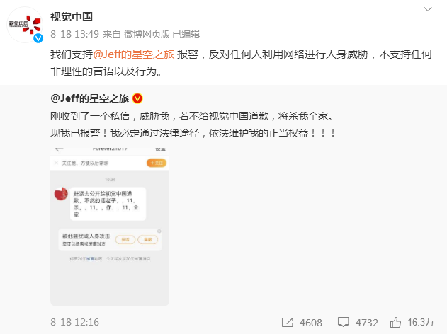 当天稍晚些时候,微博@视觉中国 转发了上述戴建峰微博,并表示,“我们支持@Jeff的星空之旅 报警,反对任何人利用网络进行人身威胁,不支持任何非理性的言语以及行为。”