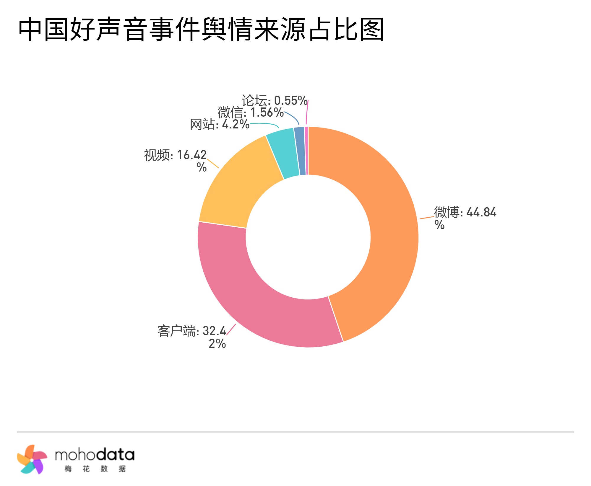 其中信息来源分布图如下图所示,声量主要集中在微博,微博占比44.84%,客户端占比32.42%,视频占比16.42%,其他信息来源占比不超过10%。