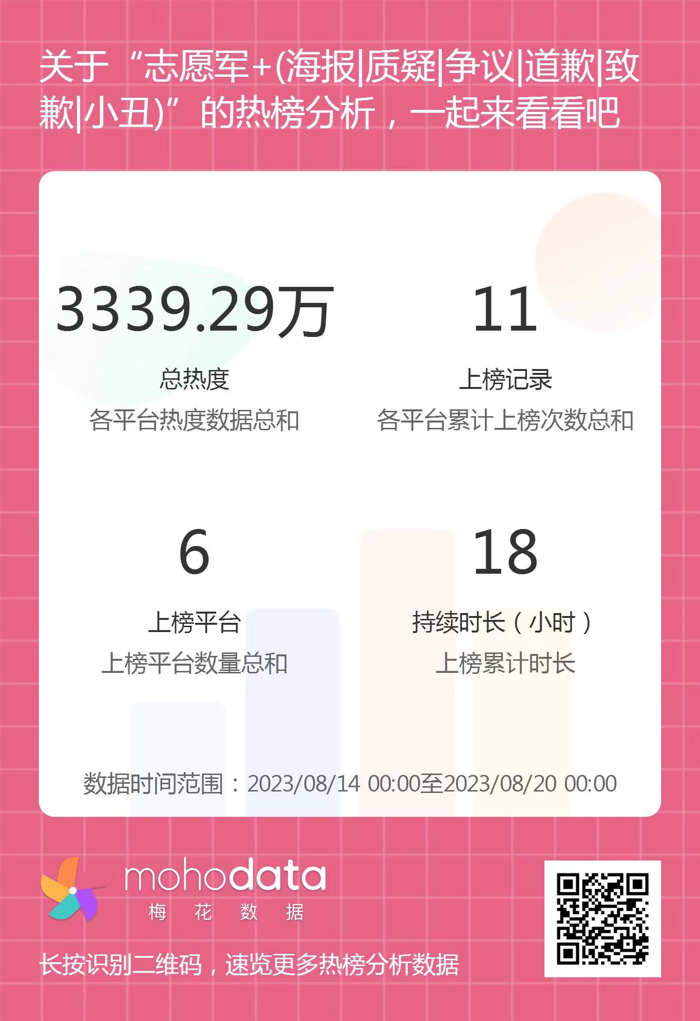 热搜方面,梅花数据统计此次《志愿军》事件的相关热搜,其中热搜热度总计3339.29万,上榜记录11次,上榜平台6家,持续时长18小时。详情可扫描以下二维码查看。