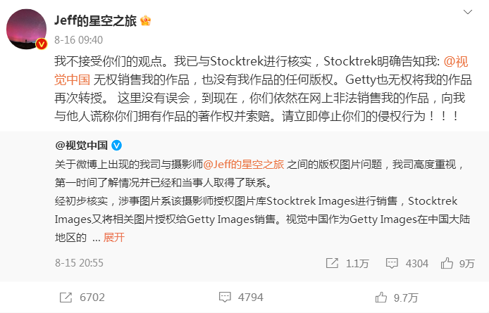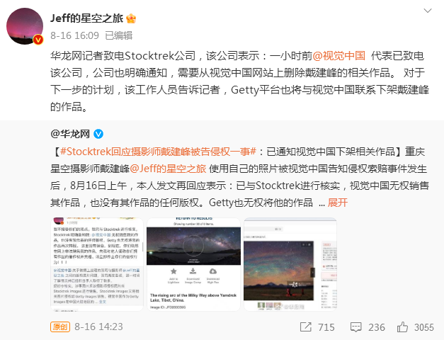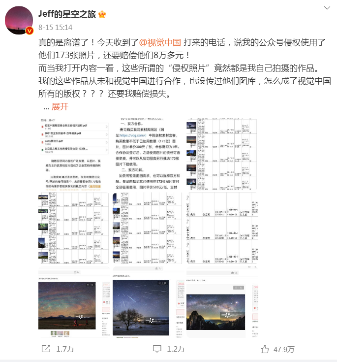 8月15日,知名摄影师博主戴建峰“Jeff的星空之旅”发文称,接到视觉中国的电话、邮件,对方称公众号“Jeff的星空之旅”侵权使用视觉中国173张图片,要求赔偿8万多元。微博发布后,该事件很快引发热议,并登上微博热搜。