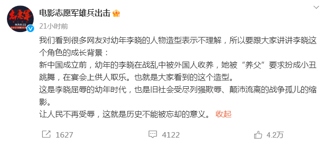 制片方在文中表示,看到很多网友对幼年李晓的人物造型表示不理解,要跟大家讲讲李晓这个角色的成长背景:新中国成立前,幼年的李晓在战乱中被外国人收养,她被“养父”要求扮成小丑跳舞,在宴会上供人取乐。也就是大家看到的这个造型。这是李晓屈辱的幼年时代,也是旧社会受尽列强欺辱、颠沛流离的战争孤儿的缩影。让人民不再受辱,这就是历史不能被忘却的意义。