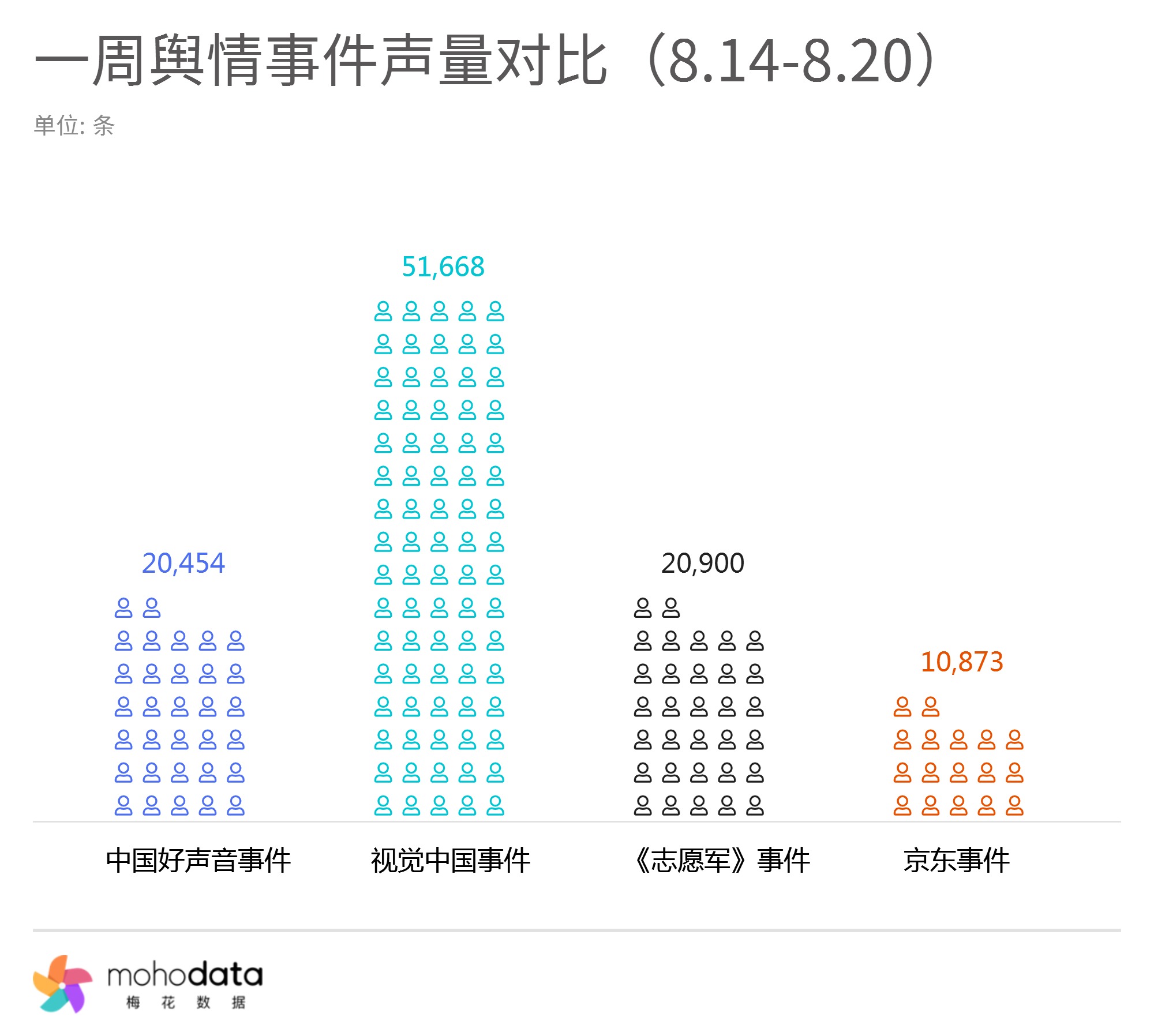 舆情声量方面,上周的主要舆情当中,“视觉中国事件”声量最高,监测期间共监测到舆情声量51668条,其次 “《志愿军》事件”舆情声量为20900条,“中国好声音赞助商事件”舆情声量为20454条,“京东事件”舆情声量为10873条。