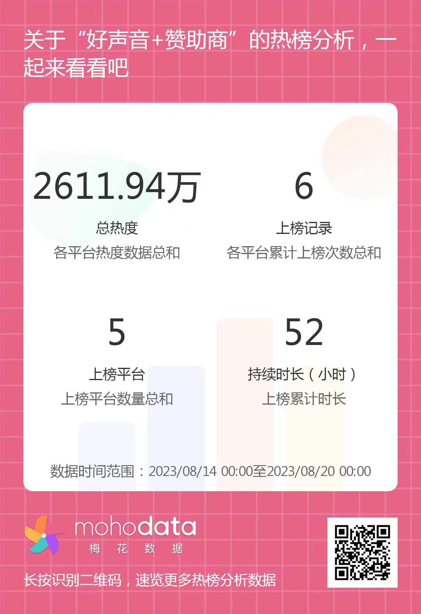 热搜方面,中国好声音事件相关热搜热度总计2611.94万,上榜记录6次,上榜平台5家,持续时长52小时。详情可扫描以下二维码查看。