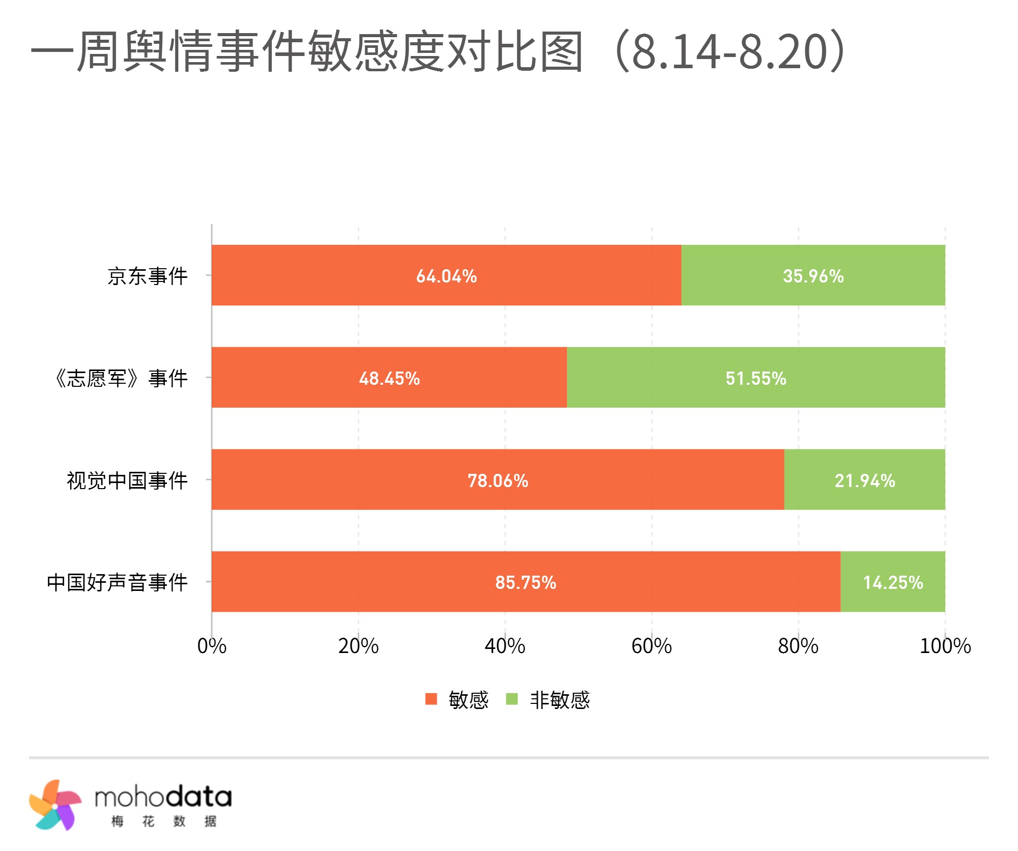 根据梅花数据舆情监测系统监测,在8月14日-8月20日,此事件共监测相关舆情声量总计51668条,敏感度78.06%。