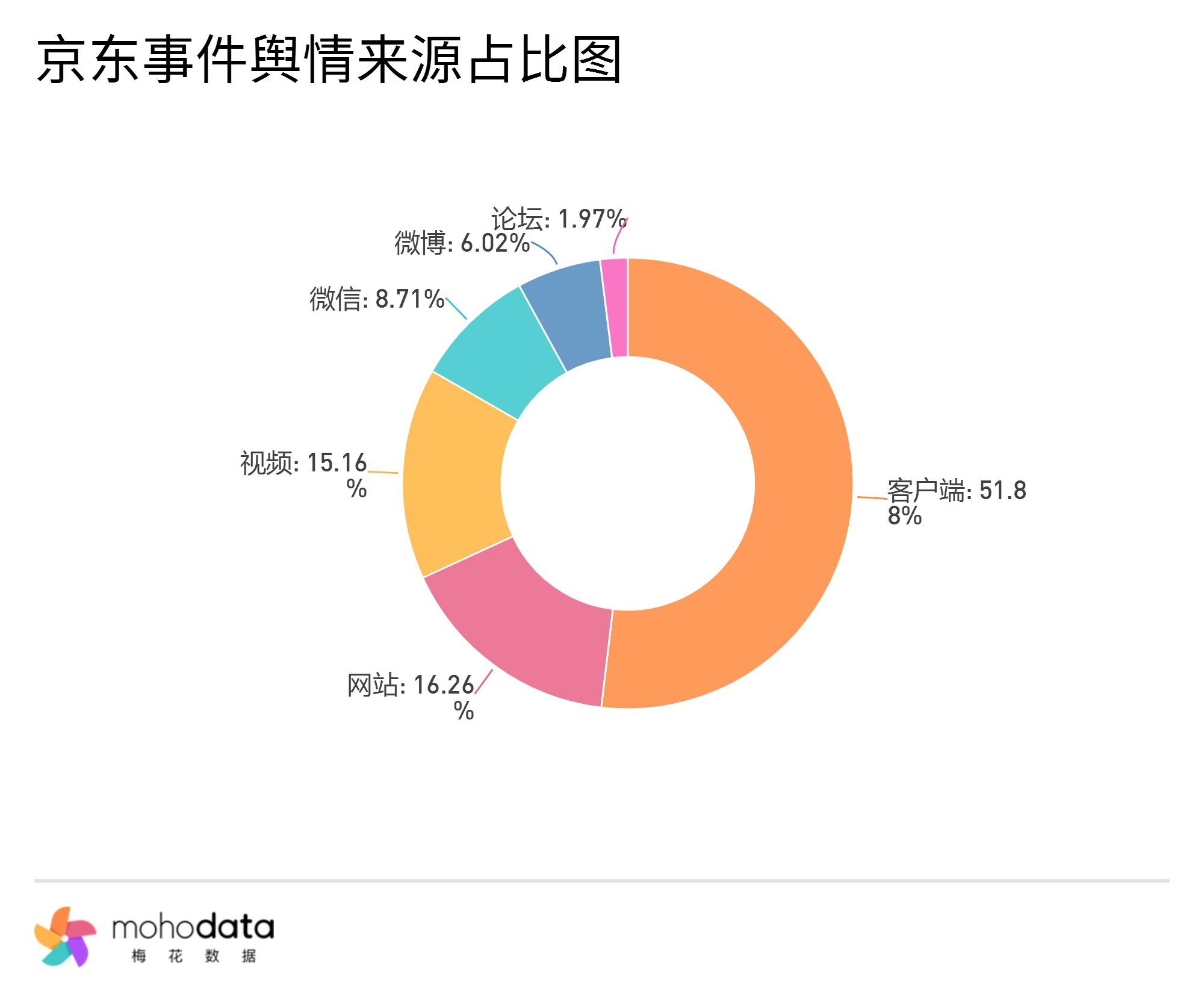 其中信息来源分布图如下图所示,声量主要集中在客户端,客户端占比51.88%,网站占比16.26%,视频占比15.16%,其他信息来源占比不超过10%。