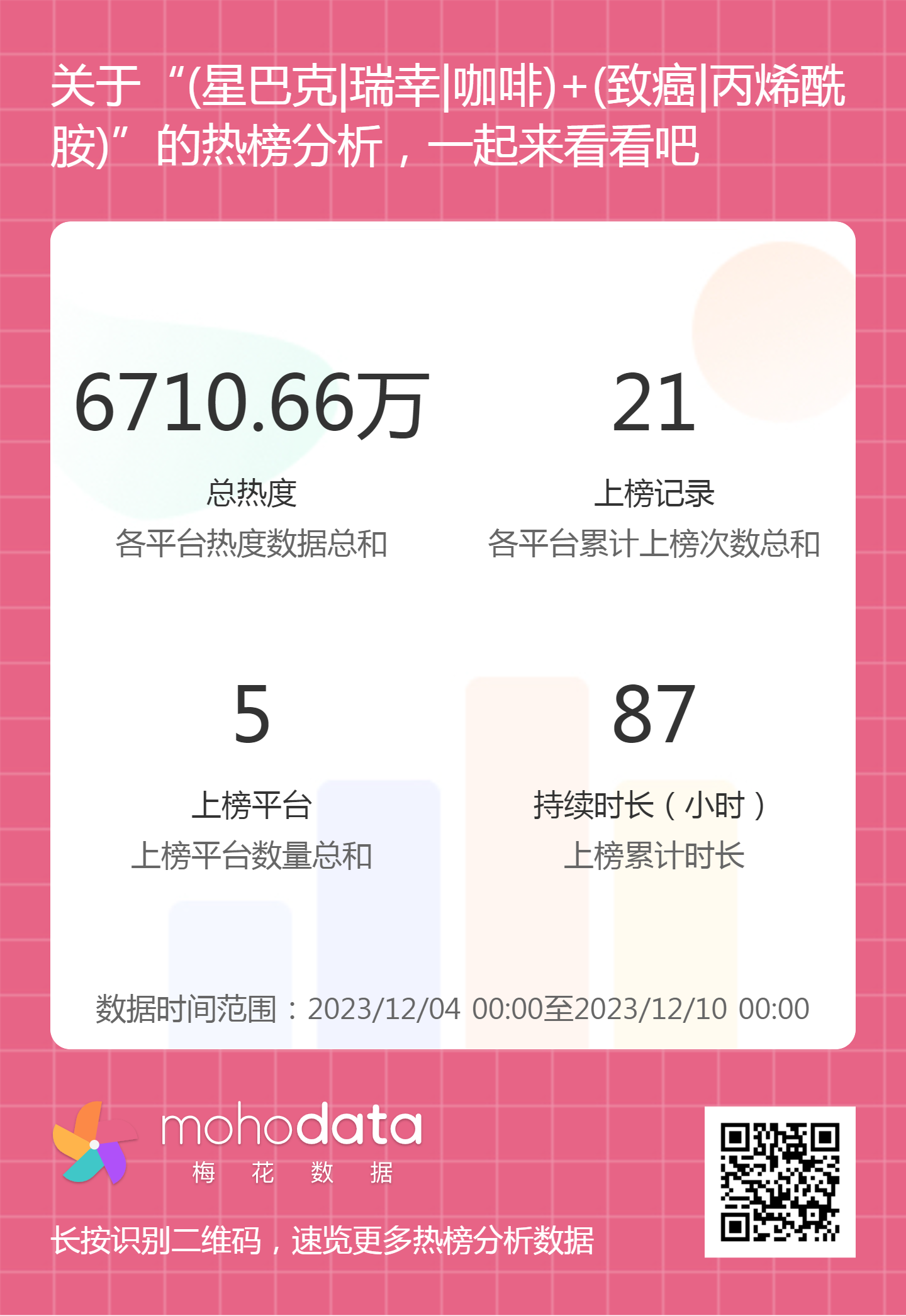 热搜方面,此次瑞幸星巴克事件相关热搜热度总计6710.66万,上榜记录21次,上榜平台5家,持续时长87小时。详情可扫描以下二维码查看。