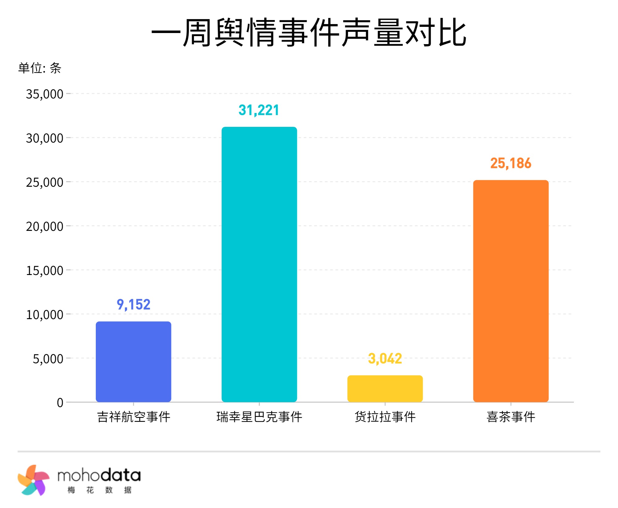 舆情声量方面,监测期间内主要舆情当中,“瑞幸星巴克事件”声量最高,共监测到舆情声量31221条,其次“喜茶事件”舆情声量为25186条, “吉祥航空事件”舆情声量为9152条,“货拉拉事件”舆情声量为3042条。
