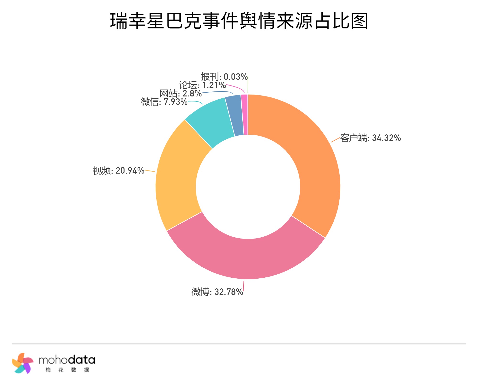 其中信息来源分布图如下图所示,声量主要集中在客户端,客户端占比34.32%,微博占比32.78%,视频占比20.94%,其他信息来源占比不超过10%。