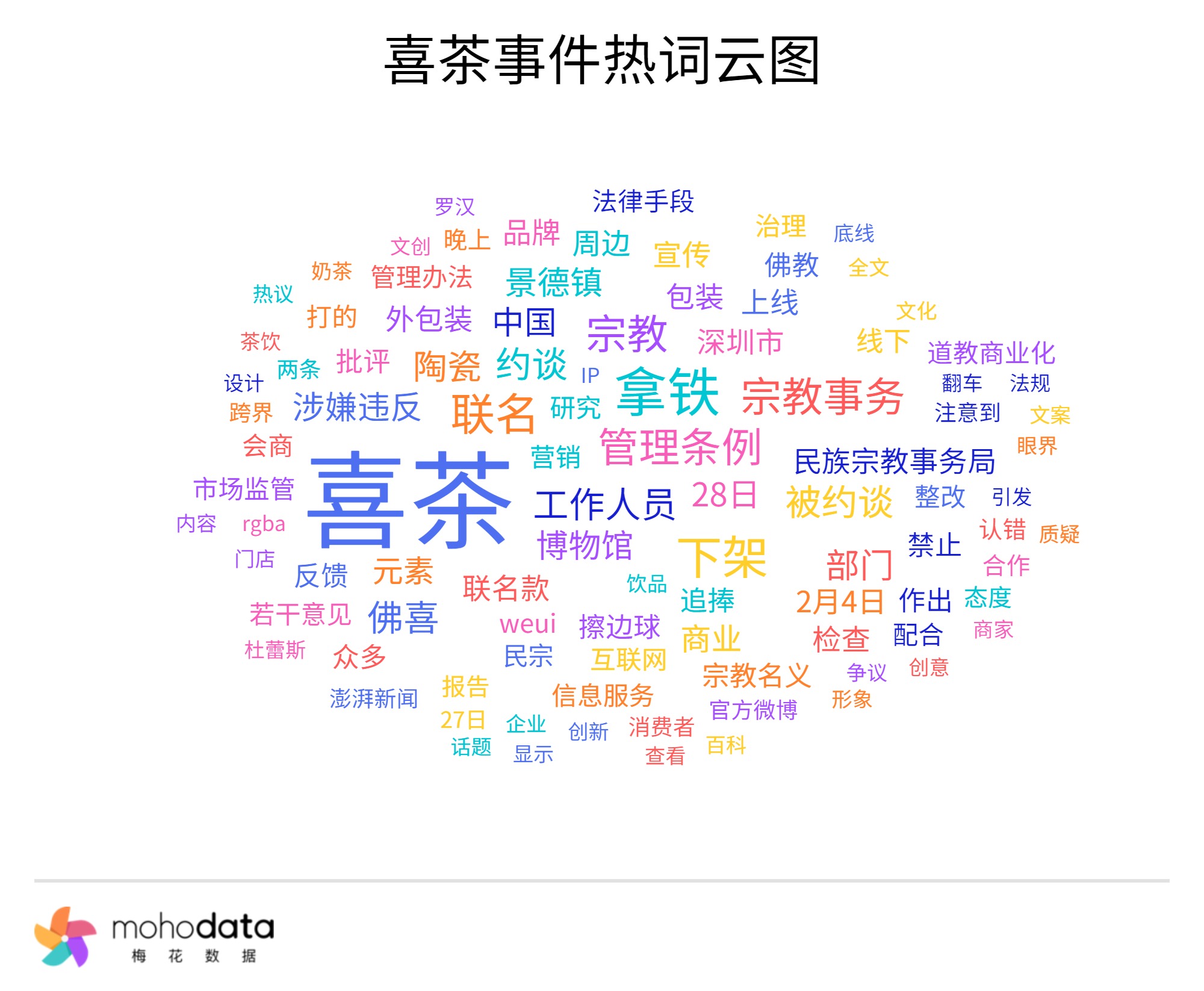 声量热词方面,热词云图如下所示,其中“宗教”“下架”“联名”“佛喜”“约谈”“博物馆”“涉嫌违反”“民族宗教事务局”“周边”等词汇排名较前。