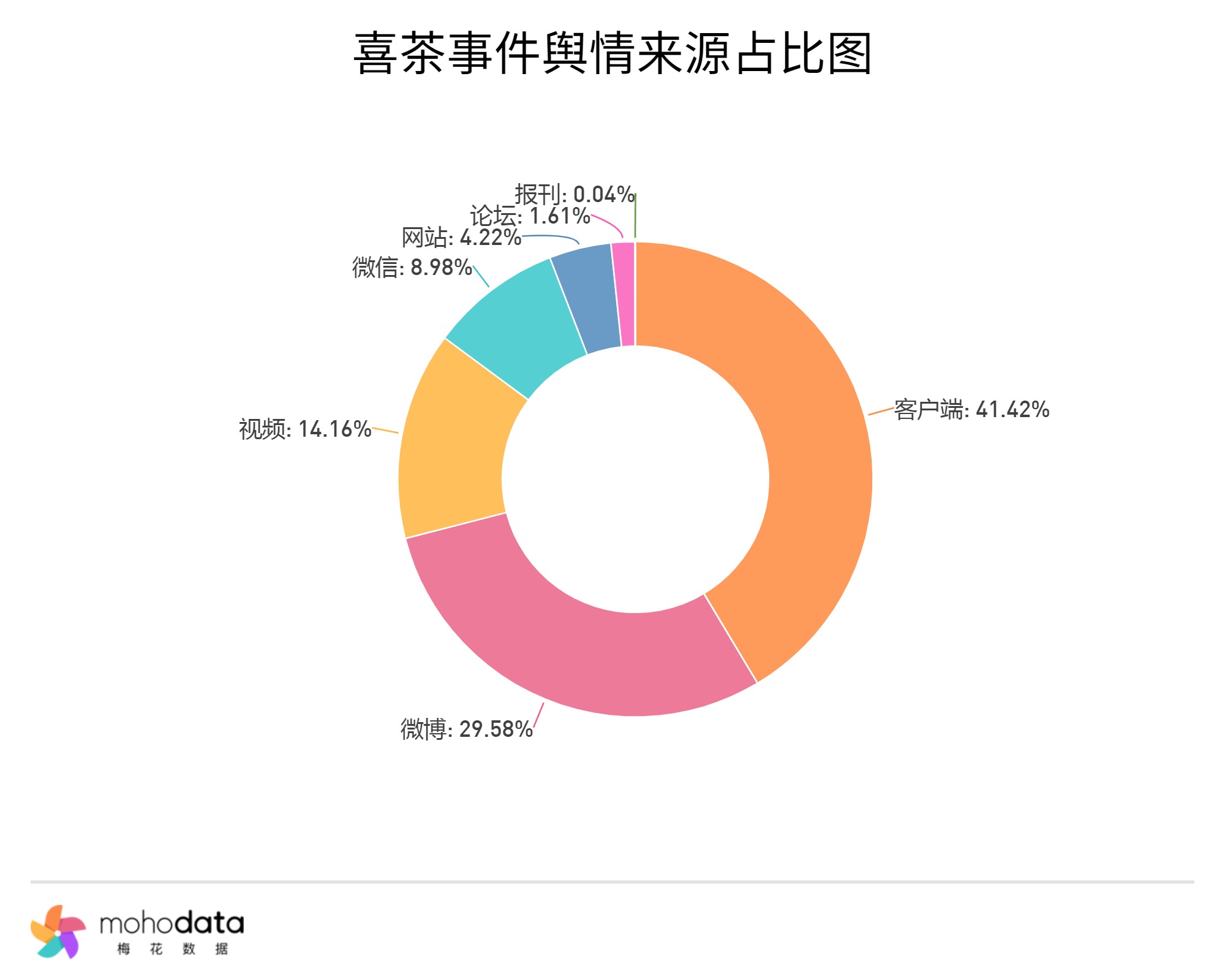 其中信息来源分布图如下图所示,声量主要集中在客户端,客户端占比41.42%,微博占比29.58%,视频占比14.16%,其他信息来源占比不超过10%。
