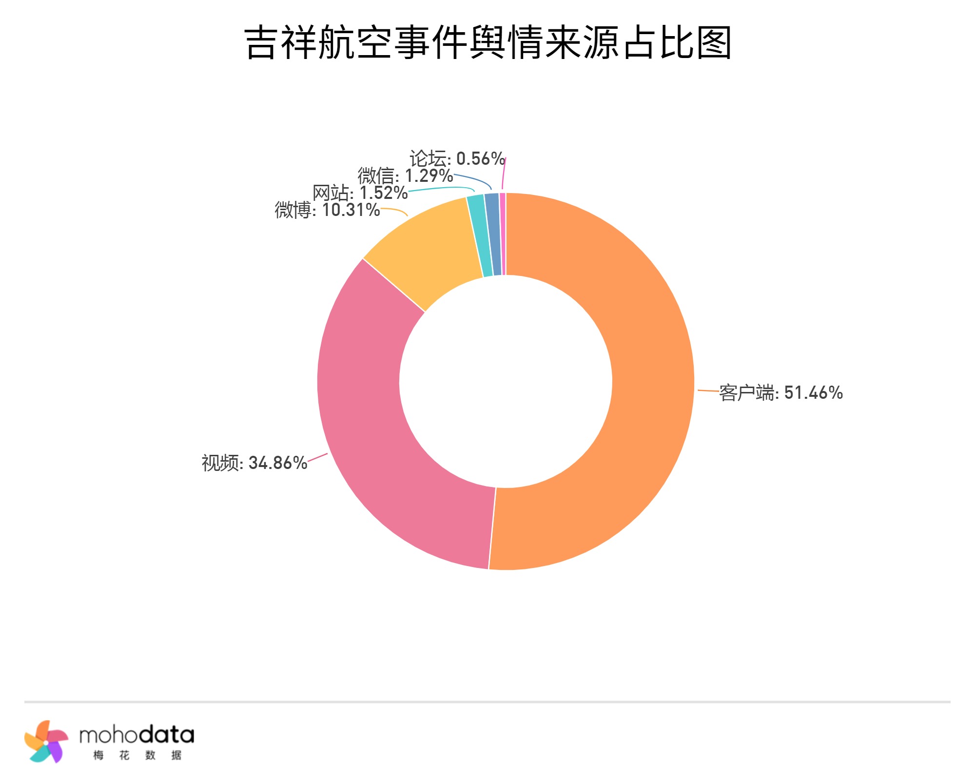其中信息来源分布图如下图所示,声量主要集中在客户端,客户端占比51.46%,视频占比34.86%,微博占比10.31%,其他信息来源占比不超过10%。