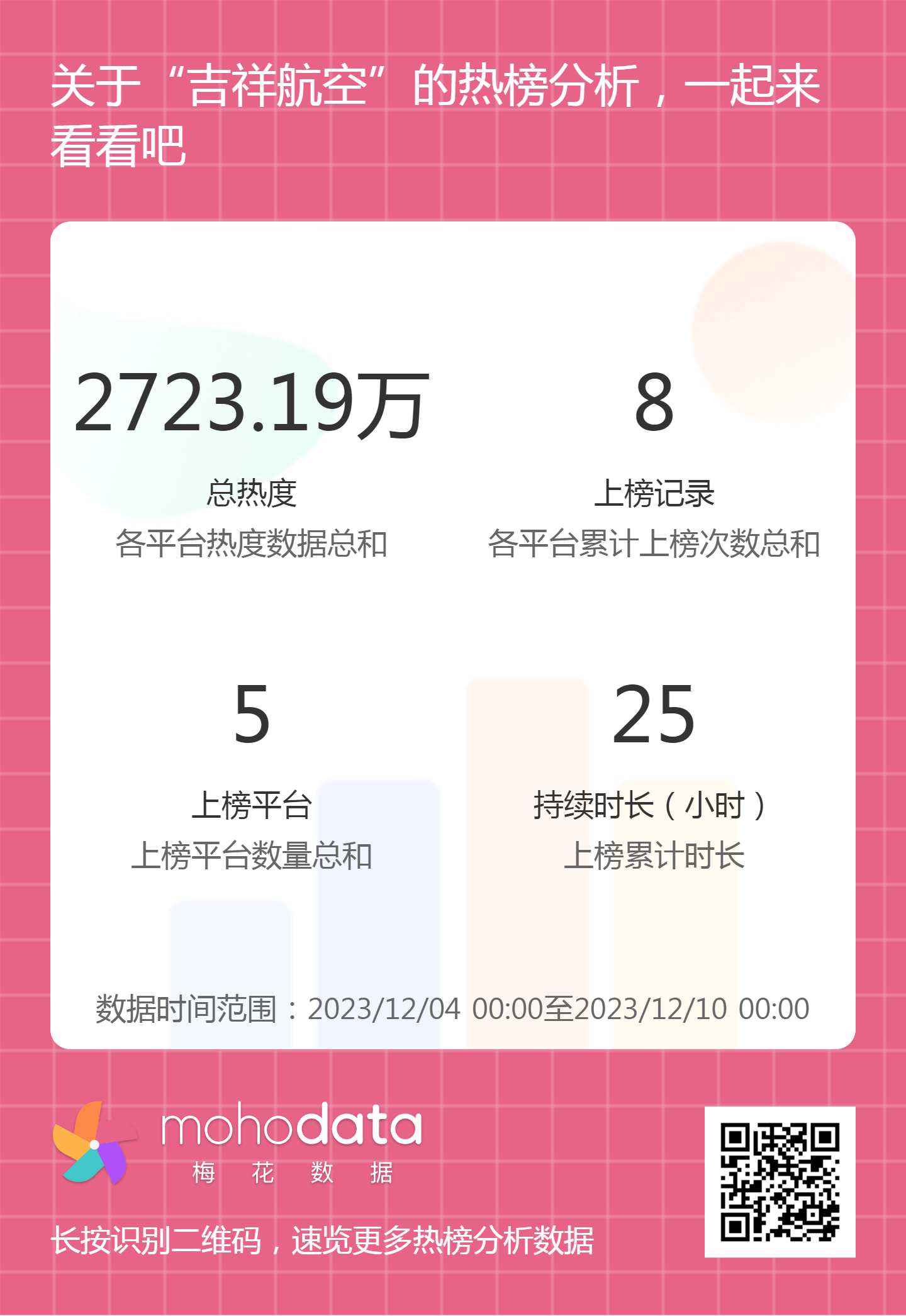 热搜方面,此次吉祥航空事件相关热搜热度总计2723.19万,上榜记录8次,上榜平台5家,持续时长25小时。详情可扫描以下二维码查看。