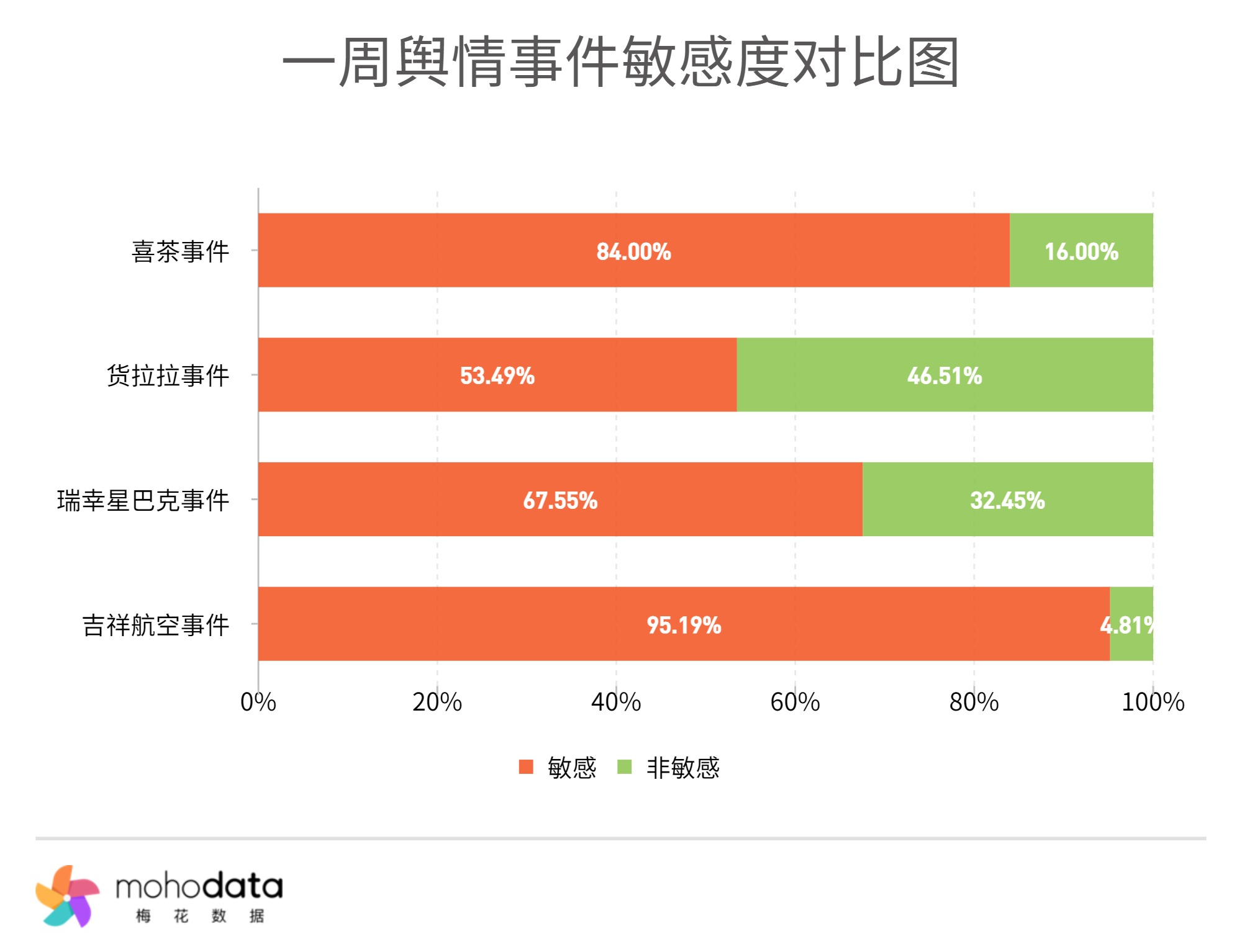 敏感度方面,“吉祥航空事件”相关的敏感度最高,占比达95.19%,“喜茶事件”占比达84.00%, “瑞幸星巴克事件”占比达67.55%, “货拉拉事件”占比达53.49%。