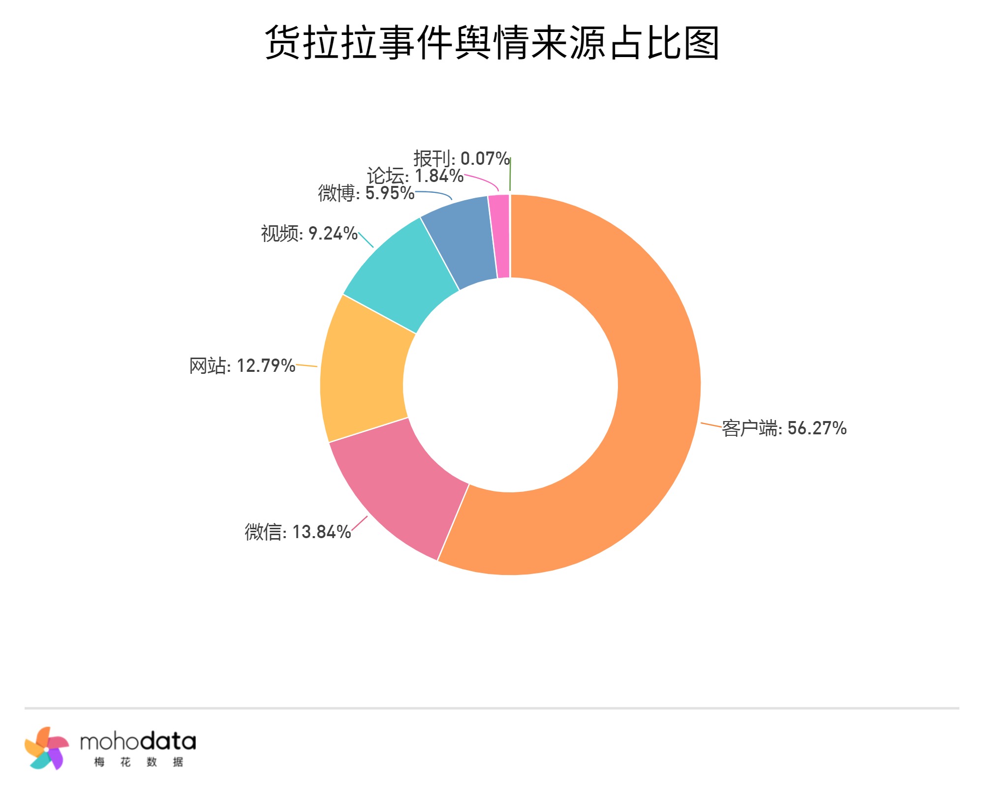 其中信息来源分布图如下图所示,声量主要集中在客户端,客户端占比56.27%,微信占比13.84%,网站12.79%,其他信息来源占比不超过10%。