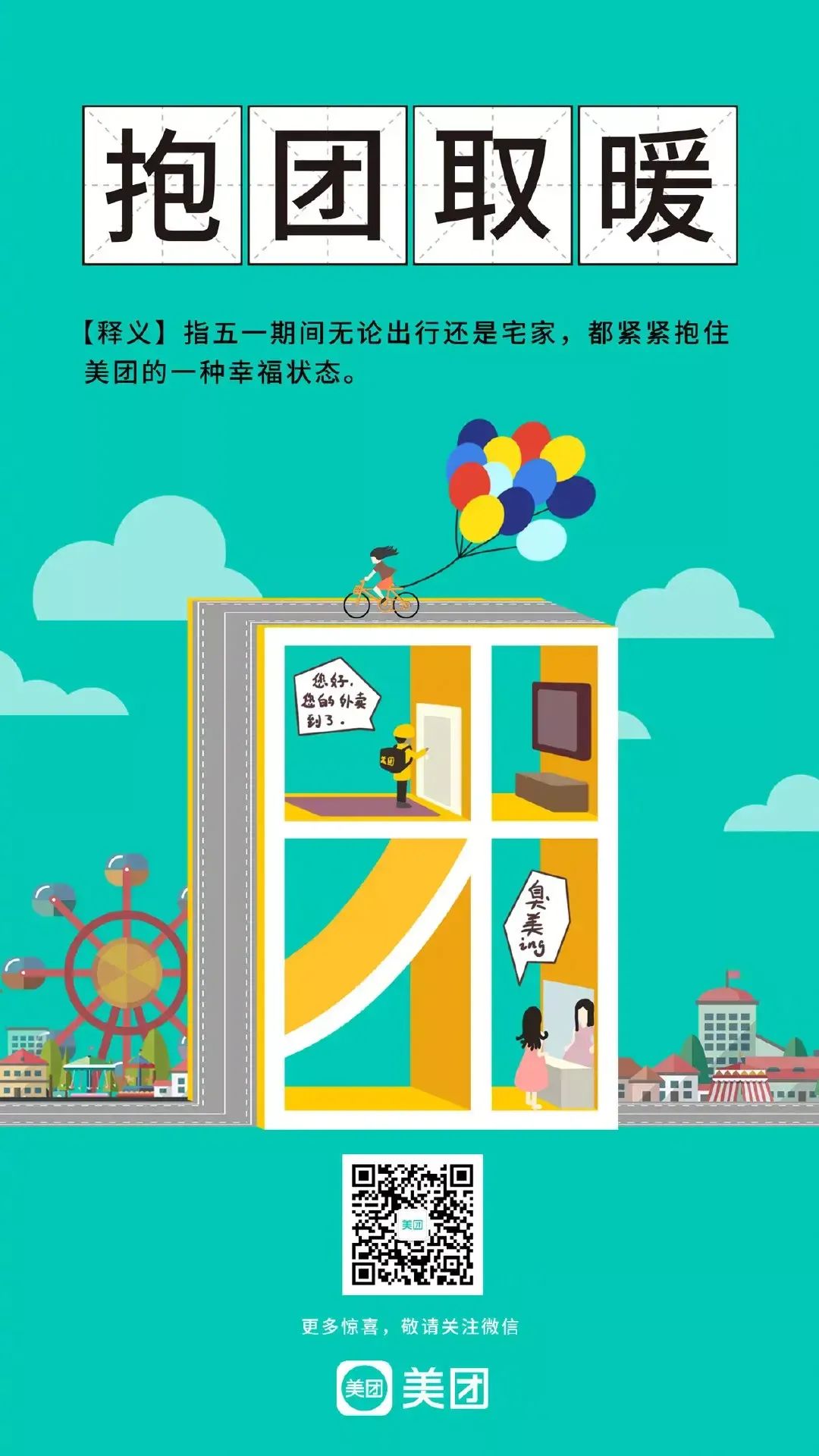 抱团取暖:指五一期间 无论出行还是宅家,都紧紧抱住美团的一种幸福状态。